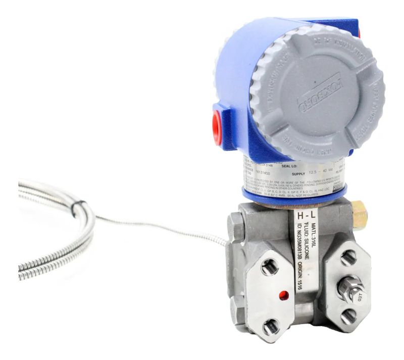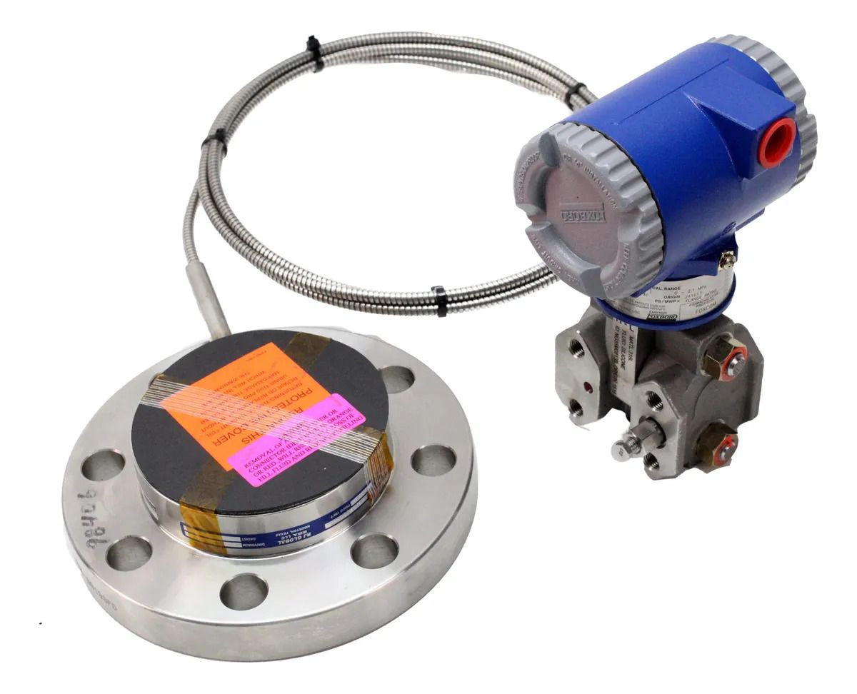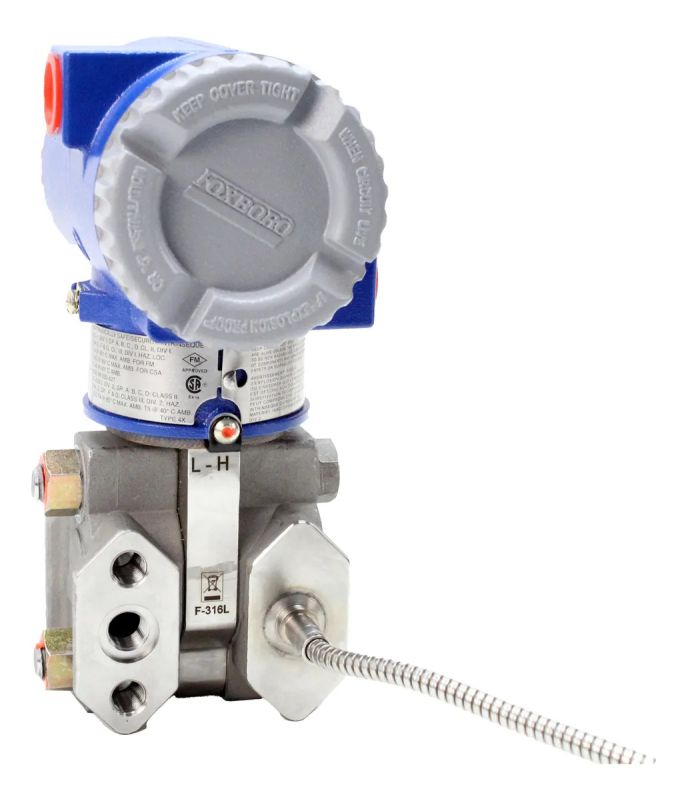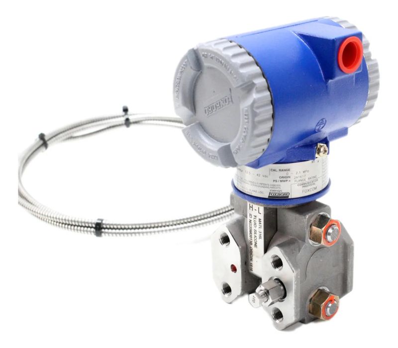 Transmissor de pressão Foxboro IDP10 com selo remoto, equipamento industrial de alta precisão, indicado para aplicações críticas em processos industriais.