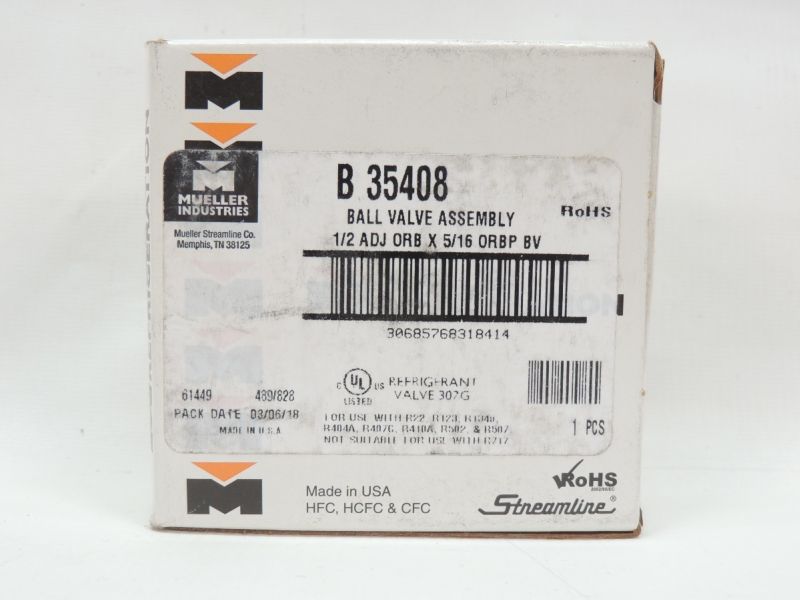Válvula de esfera Mueller Refrigeration, modelo B35408, desenvolvida para linhas de refrigeração e HVAC, indicada para aplicações profissionais que exigem alta resistência à pressão e compatibilidade com múltiplos refrigerantes.