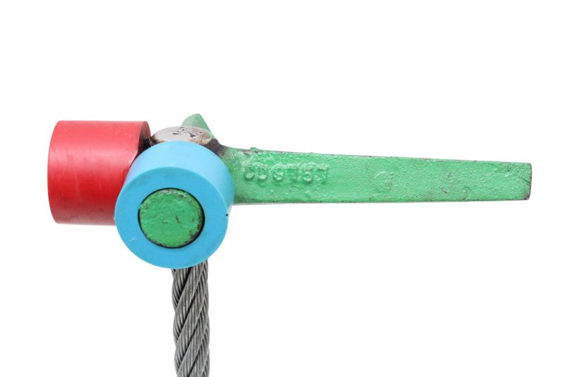 Possui corpo metálico robusto com acabamento pintado, dois blocos coloridos para fixação segura, e cabo de aço galvanizado com terminal prensado, garantindo segurança e durabilidade em aplicações exigentes.
