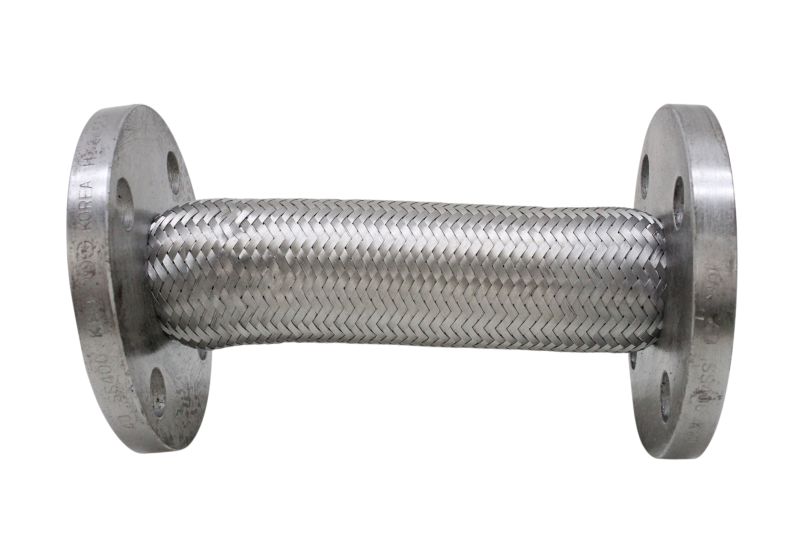 Tubo flexível metálico flangeado de 2,2 polegadas (≈ 5,8 cm de diâmetro), fabricado em aço inoxidável trançado, ideal para uso em sistemas industriais que exigem absorção de vibrações, dilatações térmicas e pequenos deslocamentos axiais.