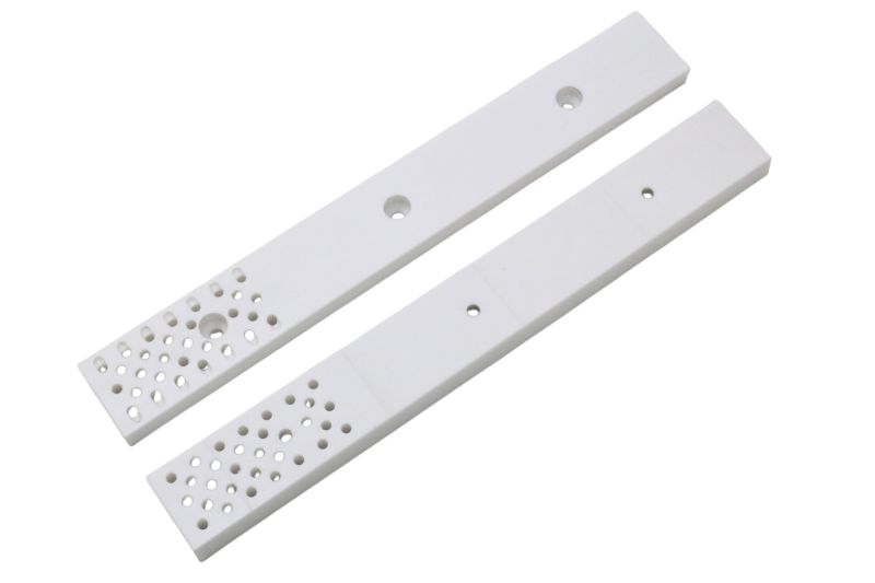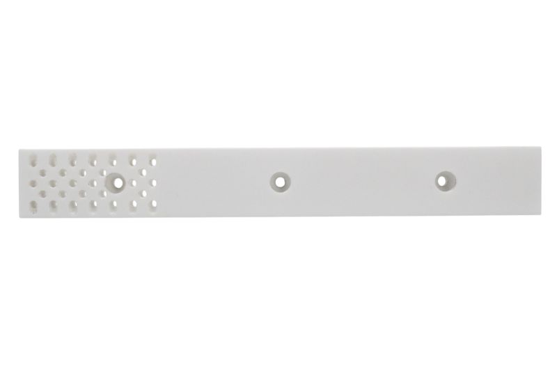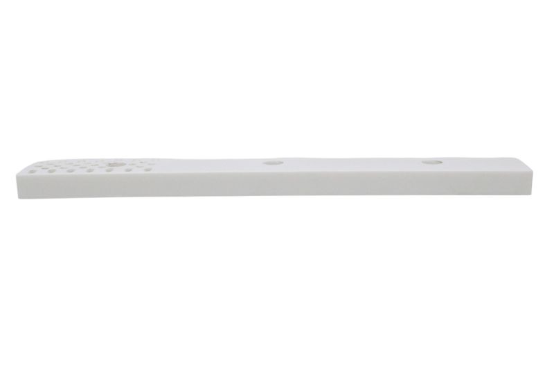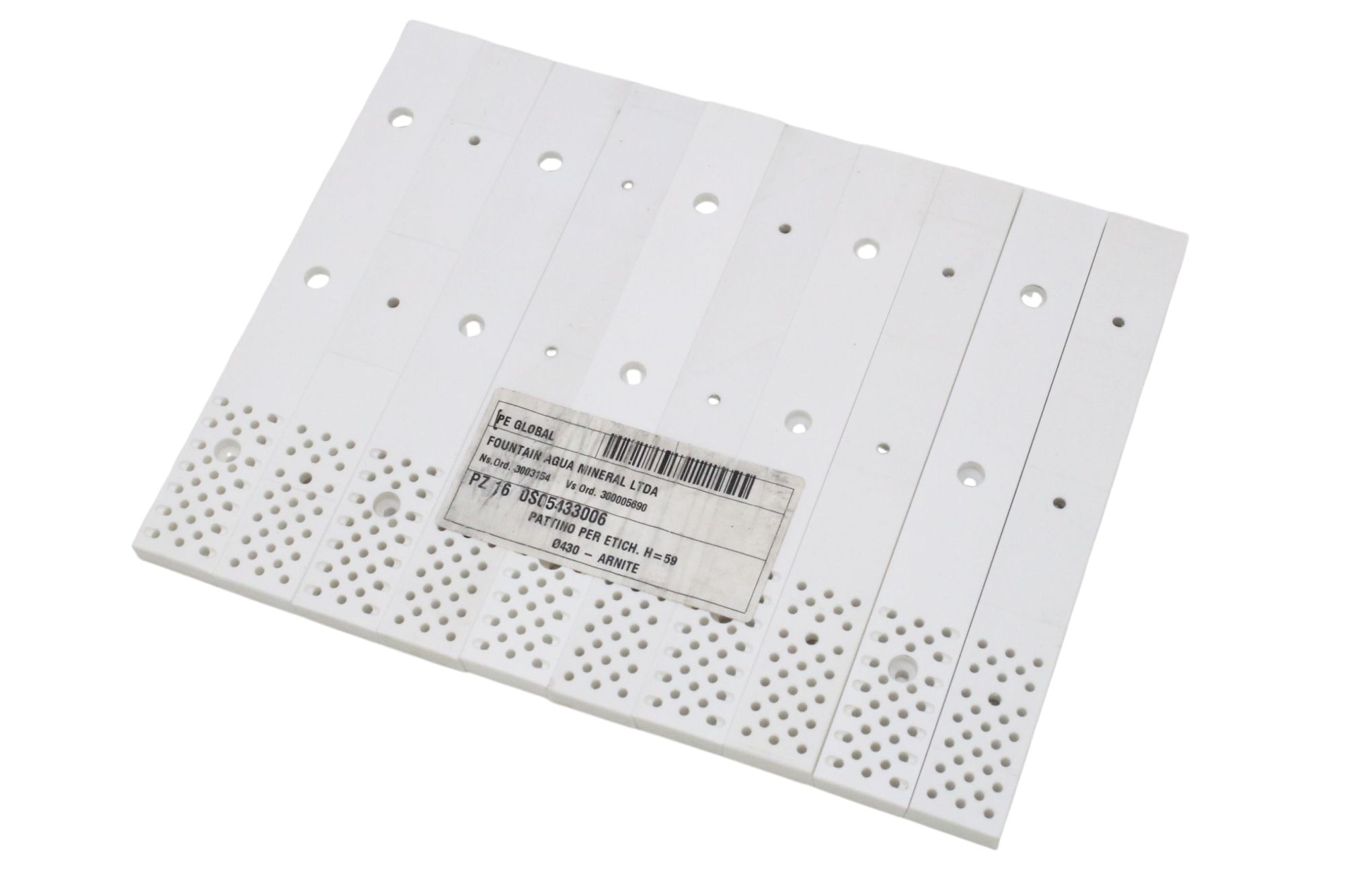 Guia perfurada de Arnite (PBT reforçado) utilizada em linhas de envase e etiquetagem automática, ideal para equipamentos industriais como OCME, Krones, PE Labellers, entre outros.