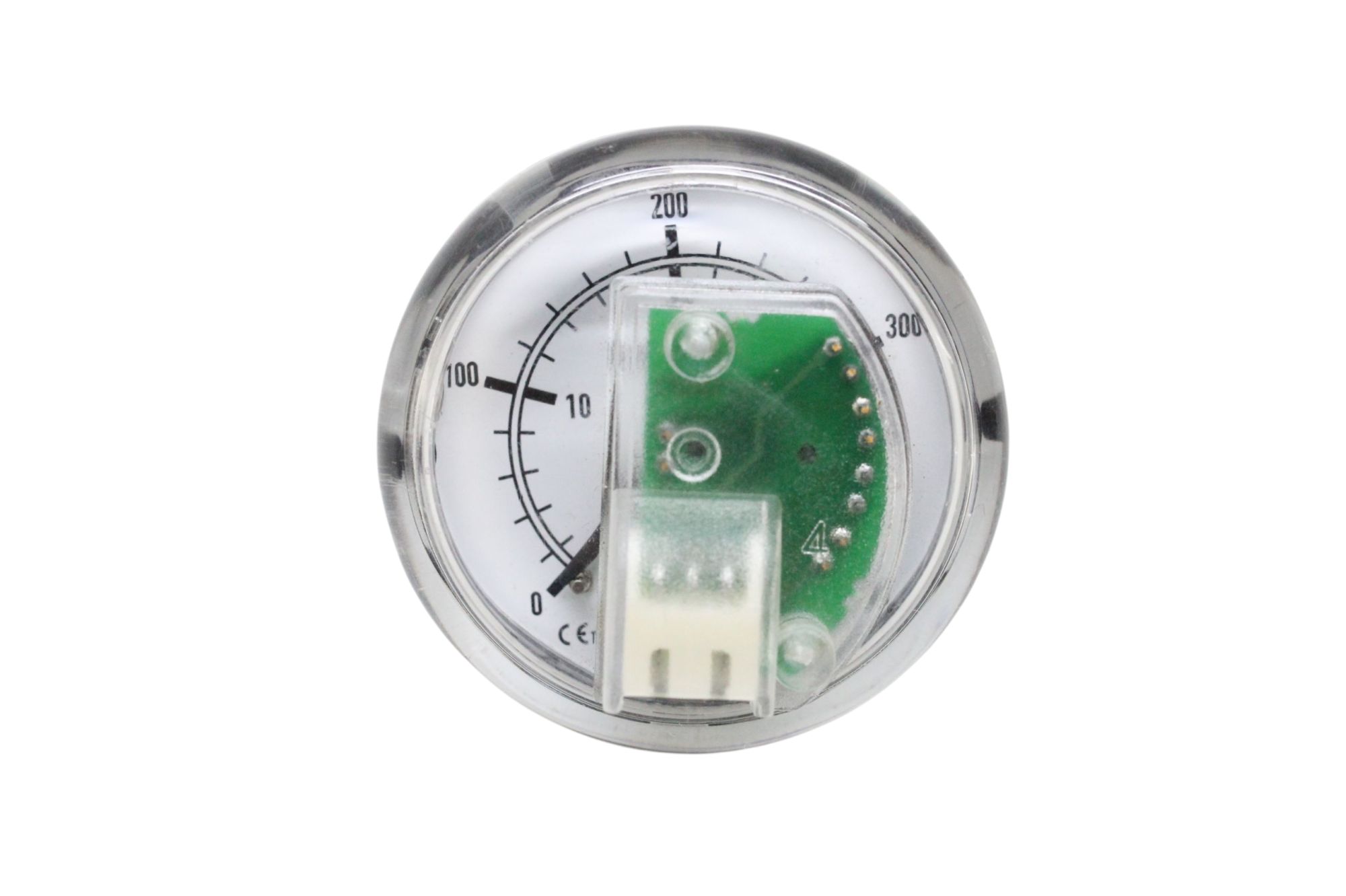Conta com conector elétrico padrão, corpo metálico com encaixe roscado em latão e visor frontal com escala analógica de fácil leitura.