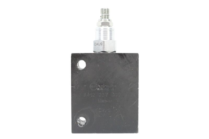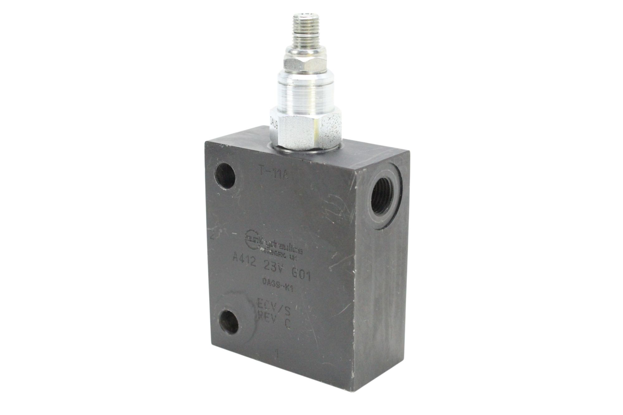 Válvula hidráulica solenóide de cartucho Sun Hydraulics modelo A412 23V G01, montada em bloco manifold padrão T-10A.