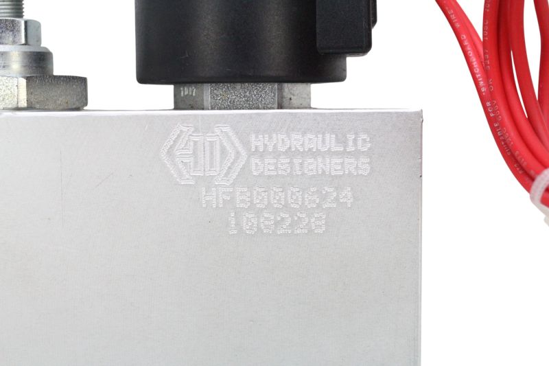 Módulo hidráulico industrial Hydraulic Designers, modelo HF8000624, equipado com válvula solenóide integrada e controle hidráulico MP / MR, desenvolvido para aplicações que exigem controle preciso de fluxo e pressão em sistemas hidráulicos.