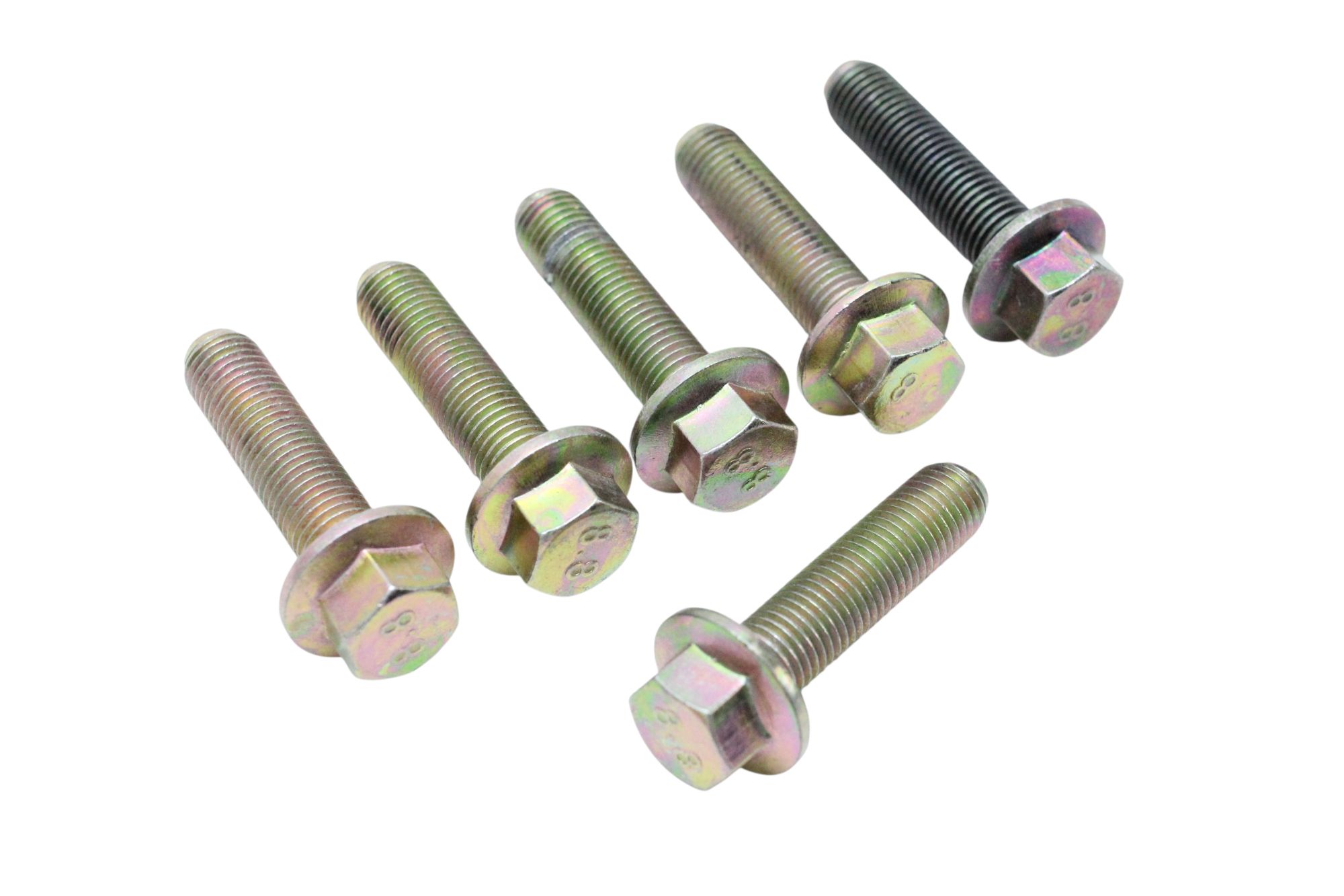Lote com 14 parafusos flangeados M10x40 mm (50mm na parte maior, 40mm na cabeça), fabricados conforme norma DIN 6921, em aço classe 8.8, com acabamento zincado para proteção contra oxidação.