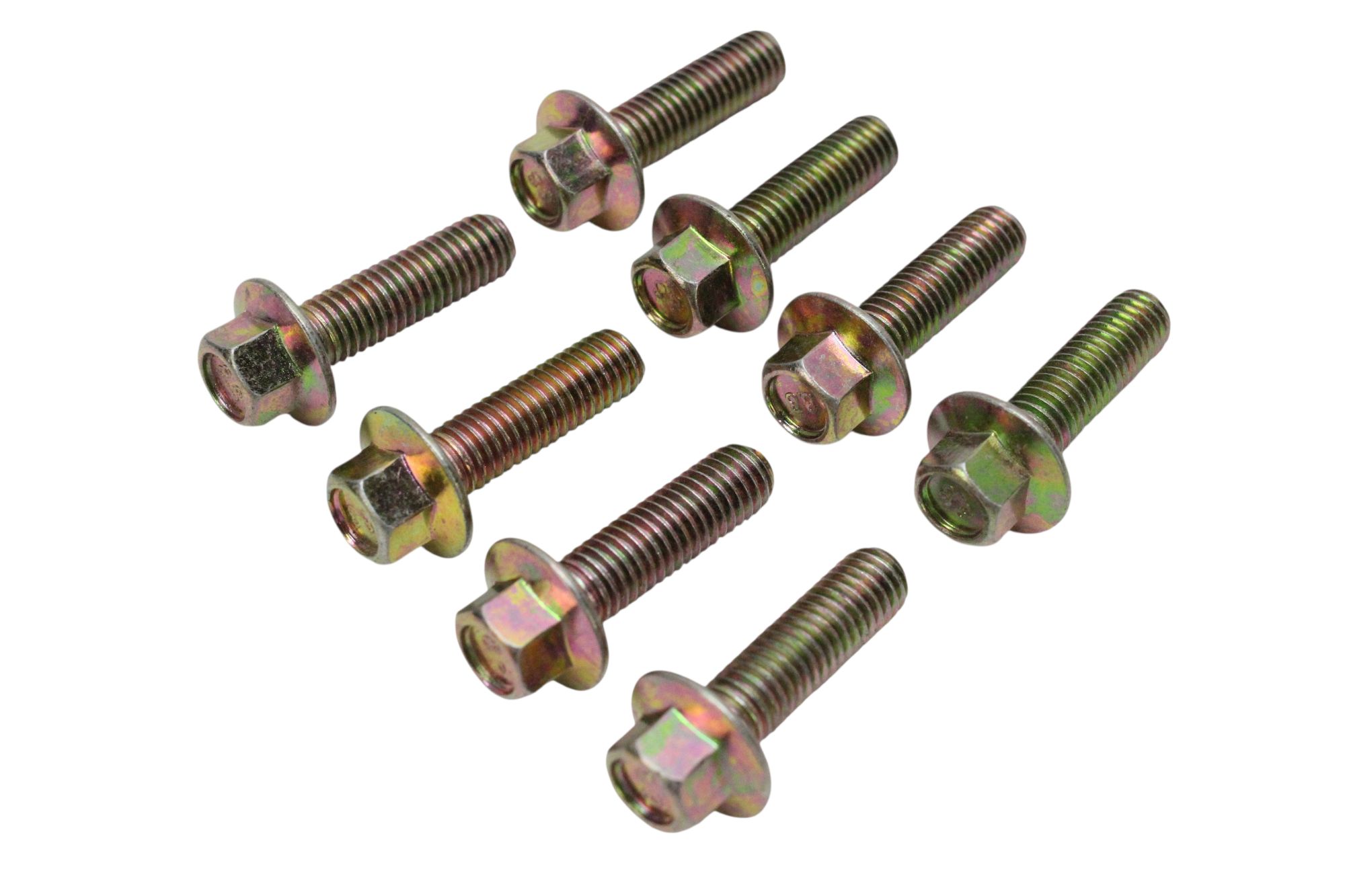 Lote com 8 parafusos flangeados M8x37 mm, fabricados em aço classe 8.8, com acabamento zincado para proteção contra oxidação.