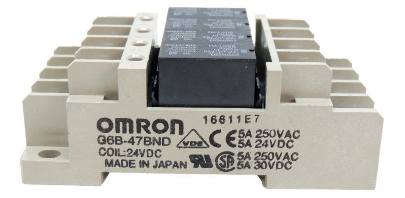 Módulo de interface de relés industriais Omron série G6B, modelo G6B-47BND, equipado com 4 relés Omron G6B montados em base para trilho DIN, pronto para uso em painéis elétricos e sistemas PLC.