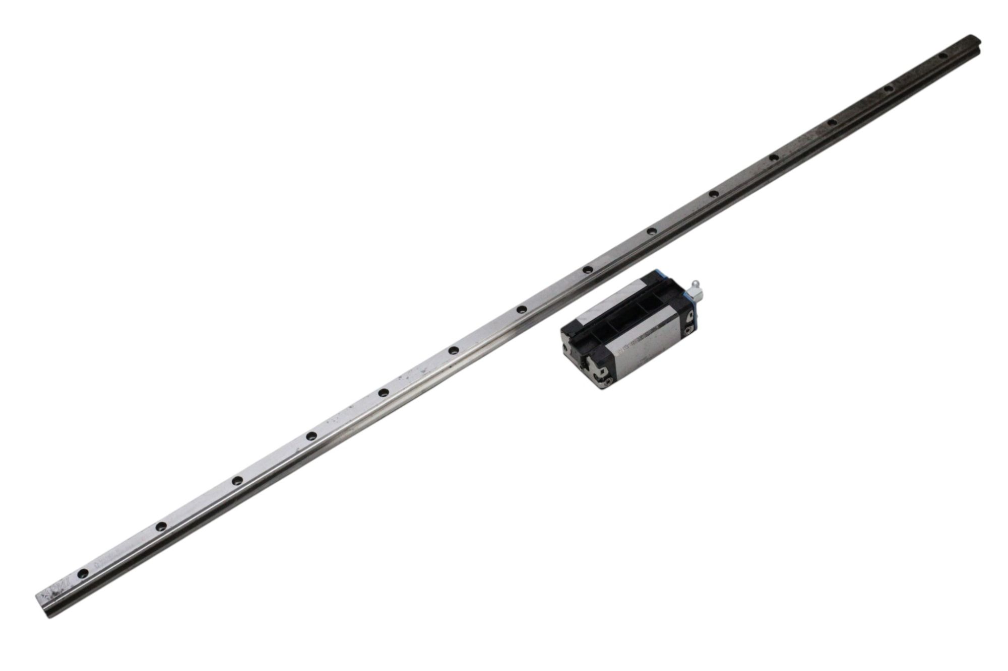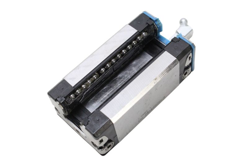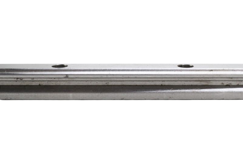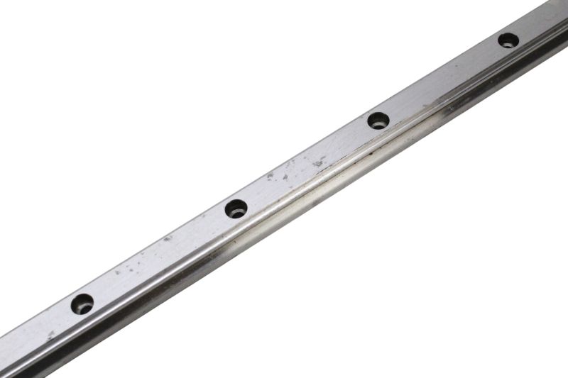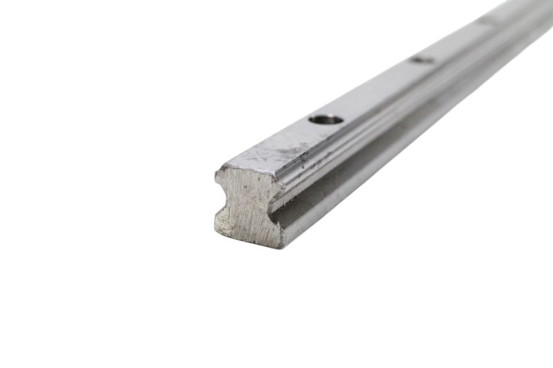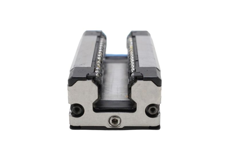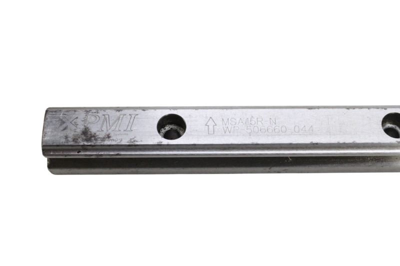 Guia linear industrial PMI Linear Motion Systems, composto por um trilhos lineares MSA15R-N com o respectivo carrinho com rolamentos, ideal para aplicações de movimento linear de alta precisão em máquinas CNC e sistemas de automação.