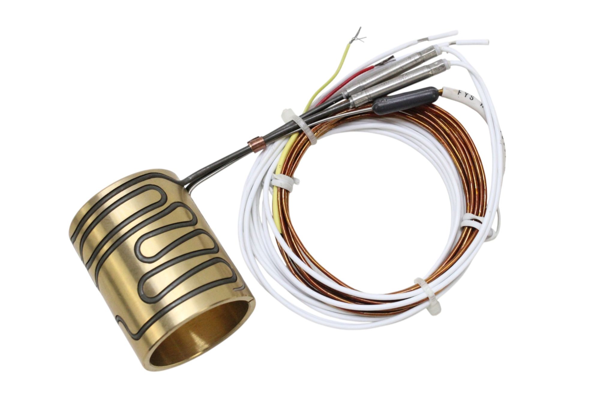 Resistência tipo coil heater industrial desenvolvida para aquecimento localizado de bicos e zonas críticas em máquinas de processamento plástico.