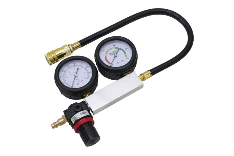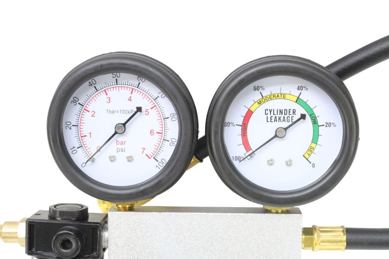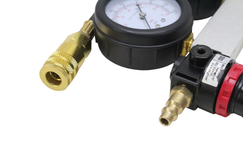 Equipamento essencial para mecânicos, preparadores e oficinas especializadas, oferecendo leitura clara através de dois manômetros: um para pressão de entrada e outro para percentual de vazamento.